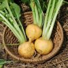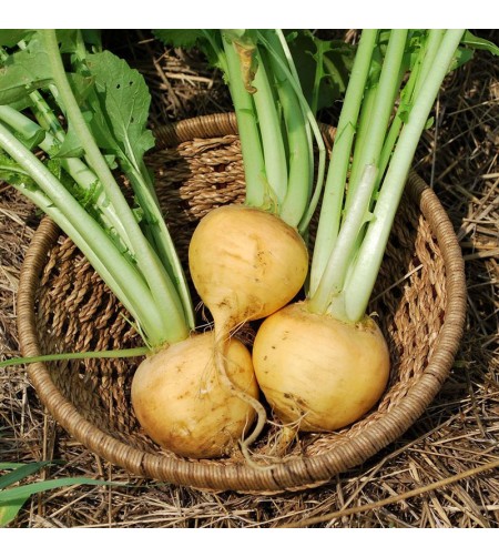 le navet Jaune Boule d’Or forme une racine ronde très lisse. Sa chair est jaune, ferme, d’une saveur délicate, sucrée et parfumée.