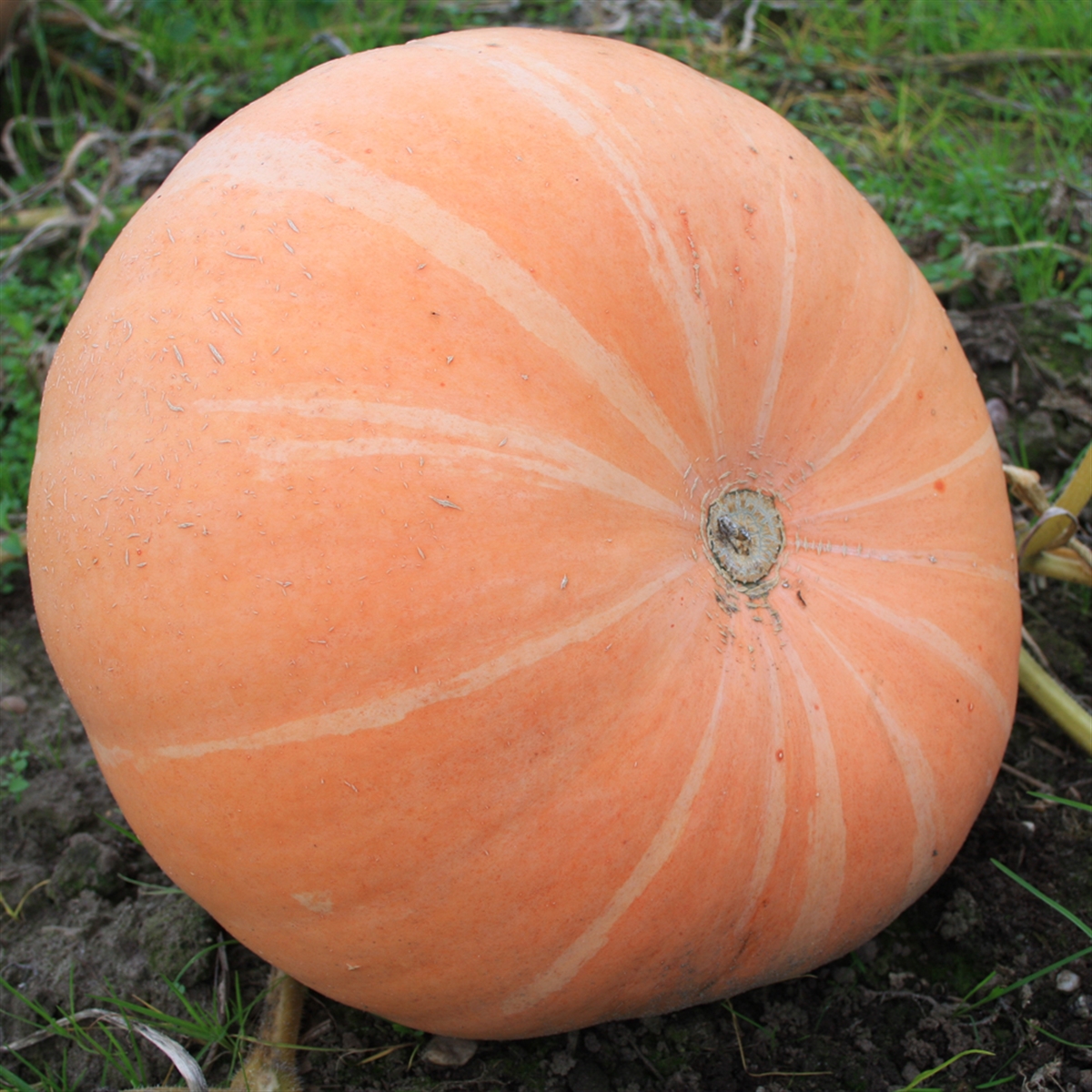 Fruits sphériques, plus ou moins aplatis aux deux extrémités, peu ou pas côtelés. De couleur jaune à rose saumon. Ils sont fendillés, brodés à maturité. La peau reste tendre. La chair très épaisse, de couleur jaune, est fine, tendre, aqueuse, un peu sucrée, de qualité moyenne. Un fruit peut atteindre 15 à 50 kg ! S’utilise en potage, soufflé…